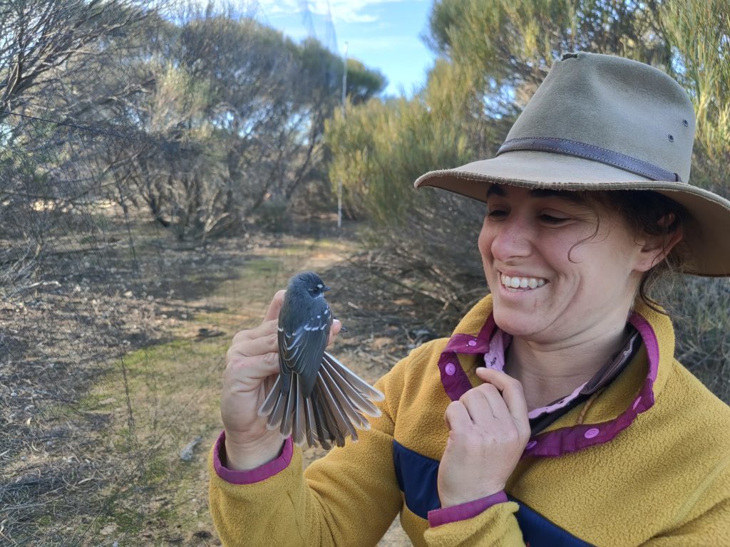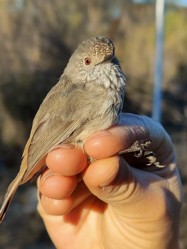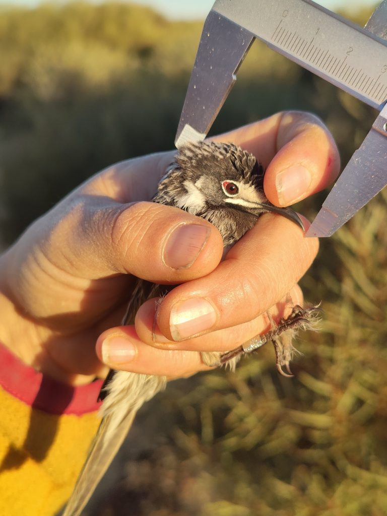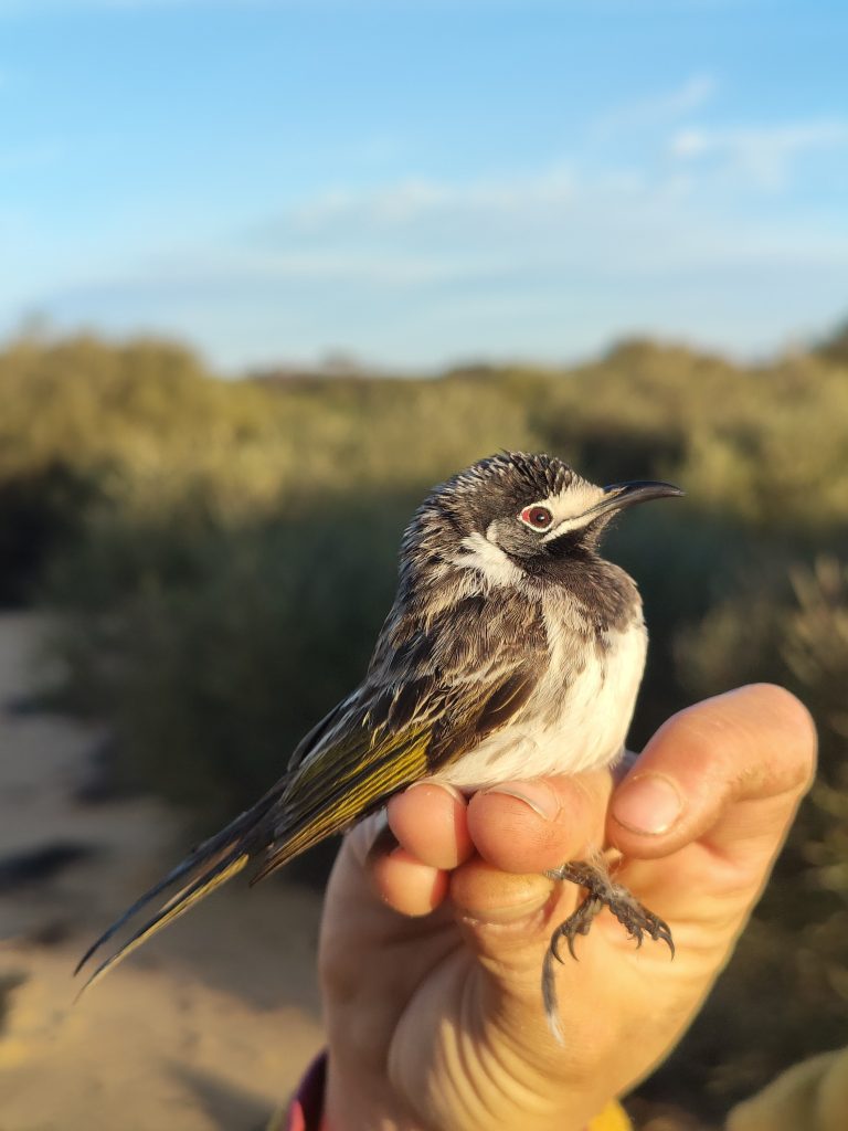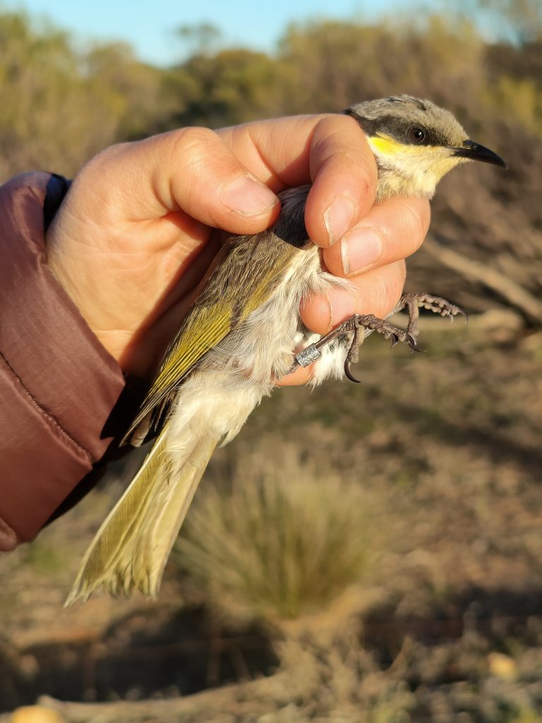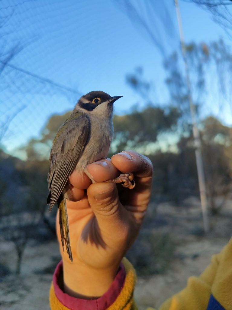 They caught a few birds – Brown-headed Honeyeater, White-fronted Honeyeater, Inland Thornbill, Grey Fantail and Singing Honeyeater (see photos below). It was fairly quiet but that was expected given the time of the year. The team will band again during an August trip, when birds are expected to be more active.
