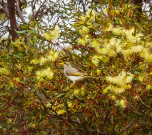 Dozens of yellow throated minors loved our many flower Eucalytus tenera